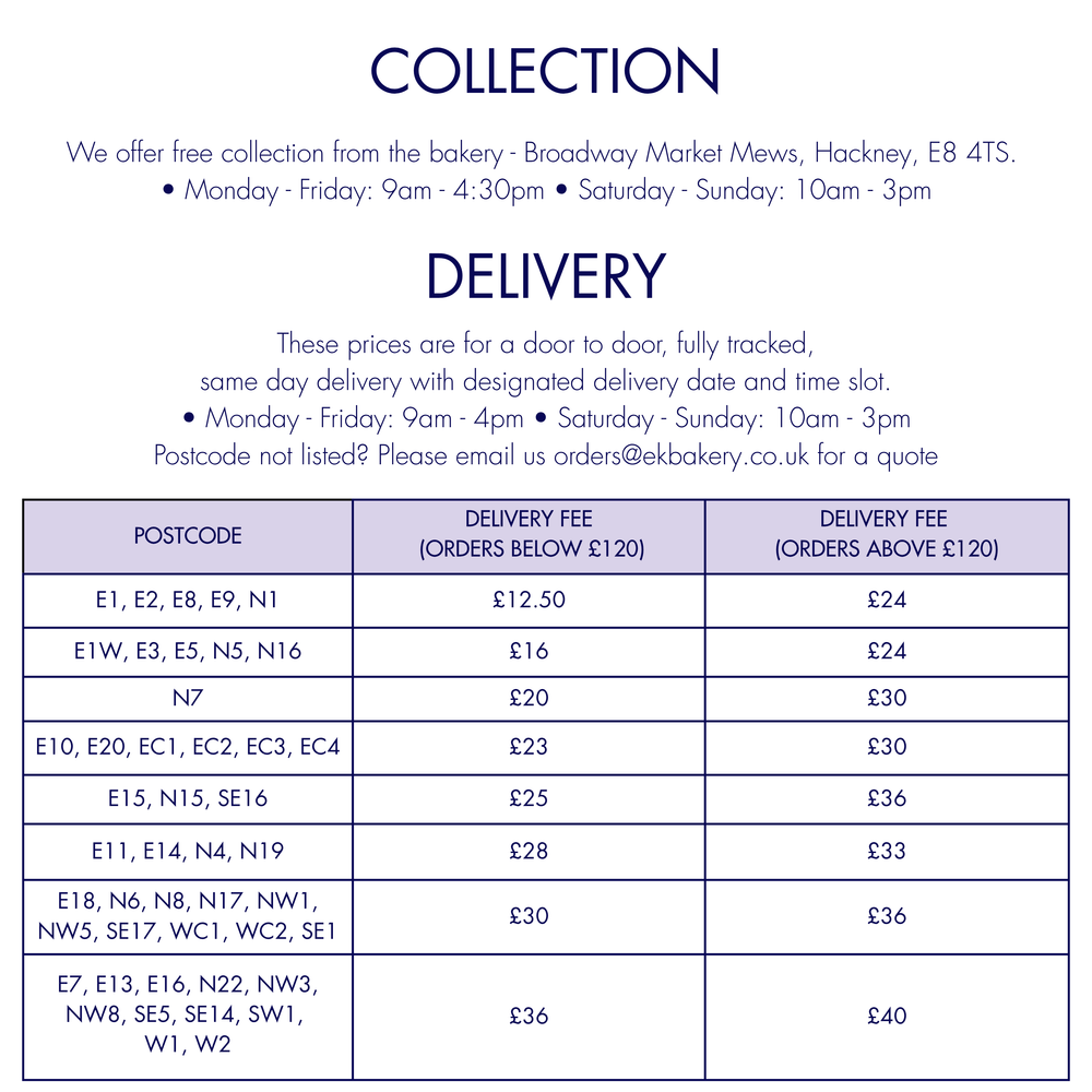 Delivering to your door. We deliver cakes across London. Delivery is priced from £12.50 or you can collect from our kitchen in Hackney