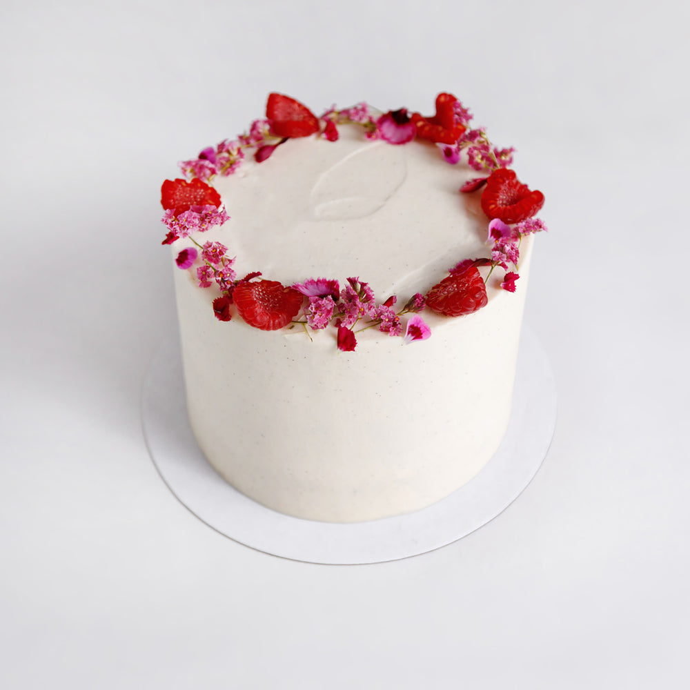 Keep it classic with our vanilla genoise sponge, filled with vanilla bean mascarpone and housemade raspberry jam. Finished with a layer of deliciously silky white chocolate meringue buttercream.